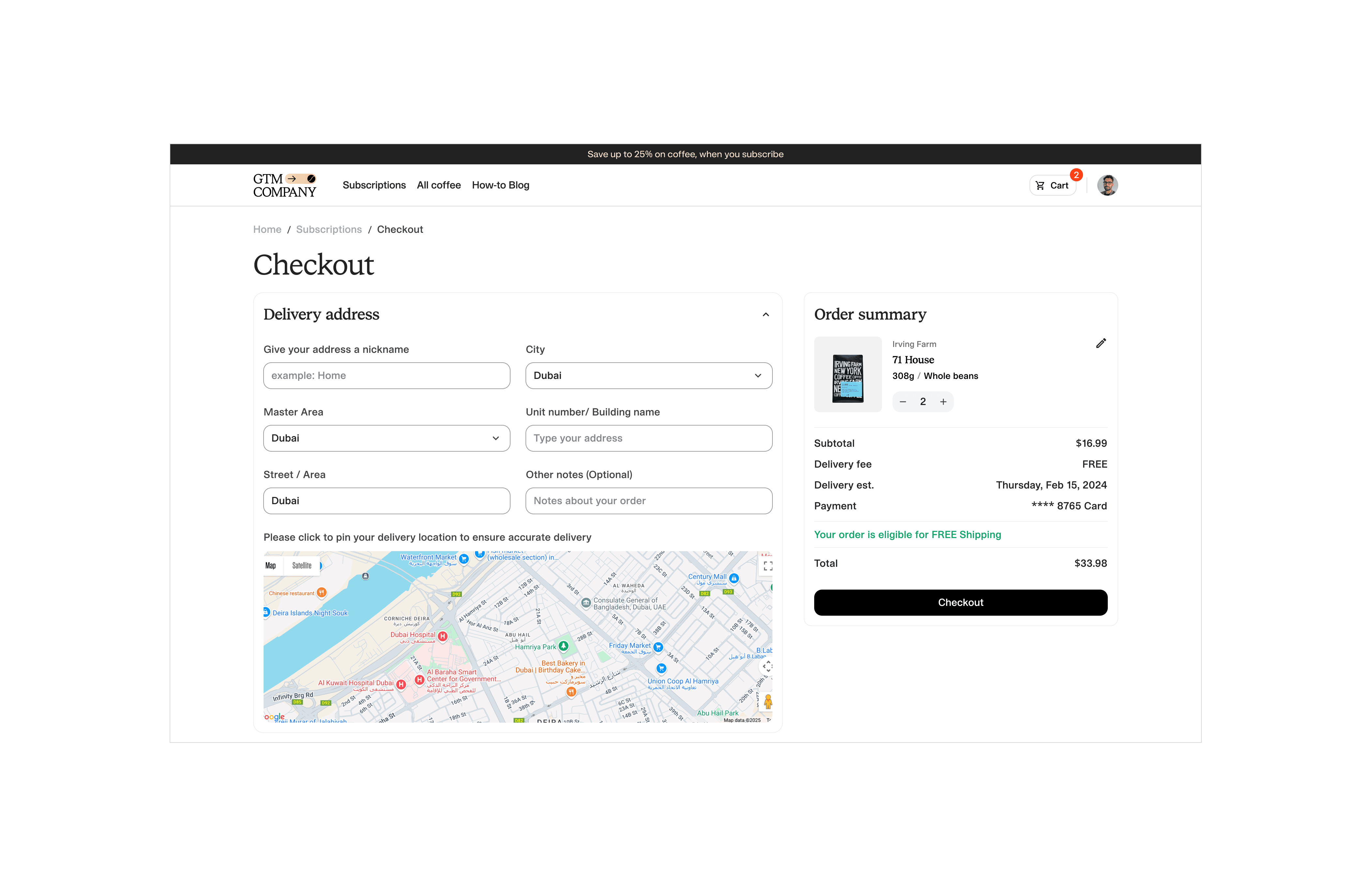 We built their end-to-end subscription platform from the ground up. Customers can now discover premium roasters, customize their subscriptions (grind type, bag size, delivery frequency), and manage everything through an intuitive interface. The platform handles multi-vendor inventory, location-based delivery routing across UAE markets, and automated recurring billing.